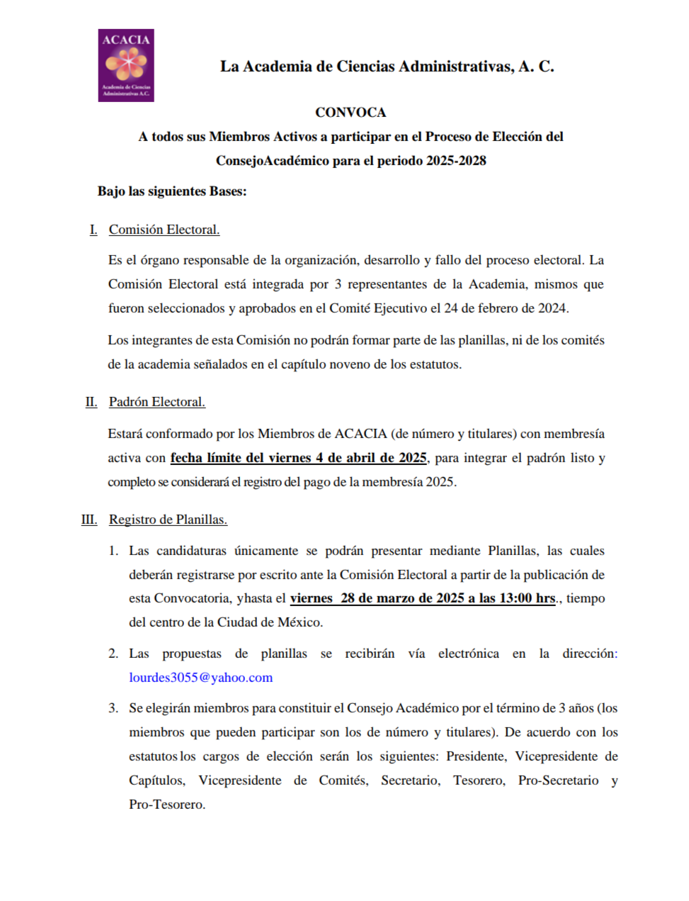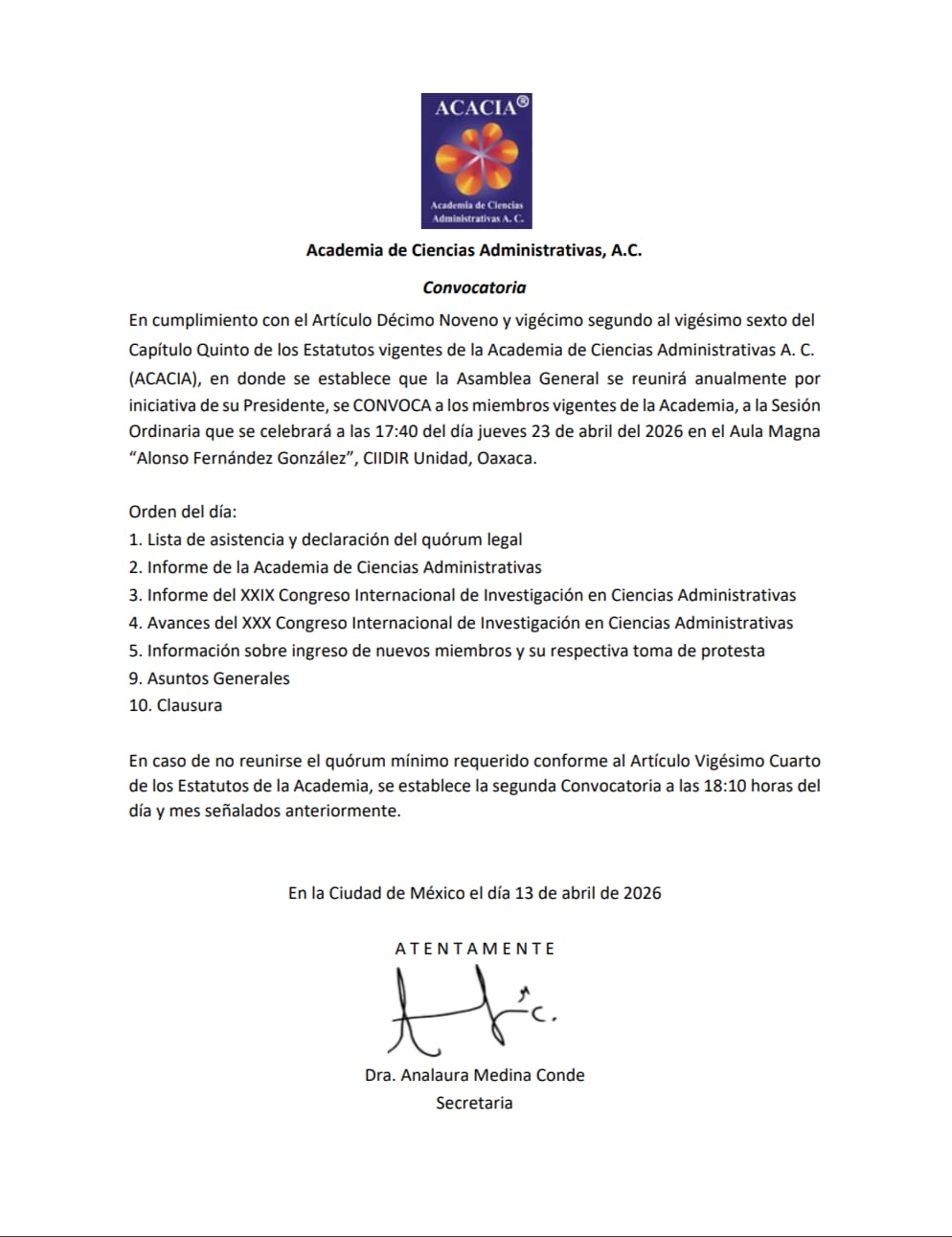 Convocatoria ACACIA. Asamblea – 2026