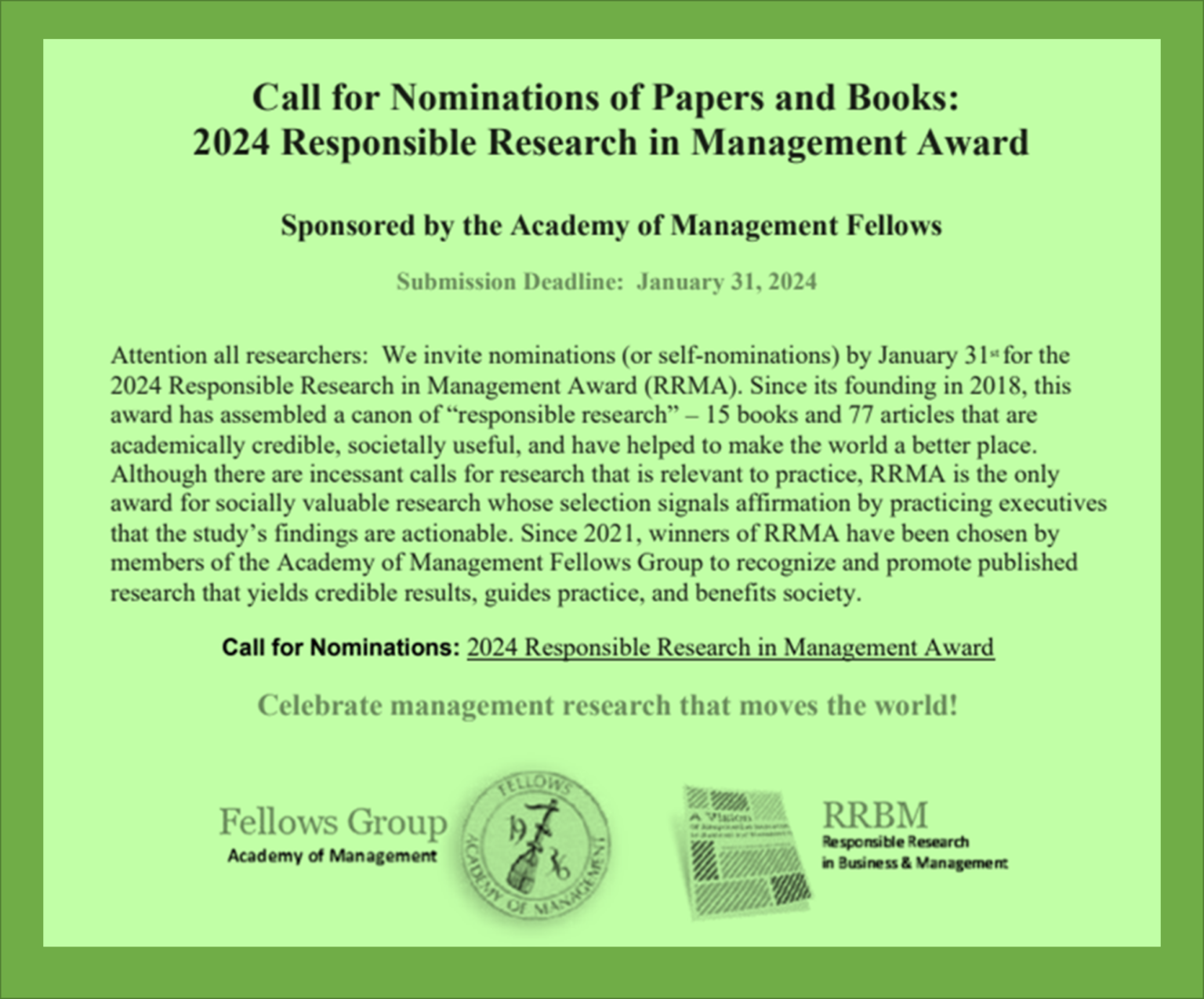 ACACIA A. C, invita a todos los investigadores a presentar nominaciones (o autonominaciones) antes del 31 de enero para el Premio a la Investigación Responsable en Gestión (RRMA) 2024.