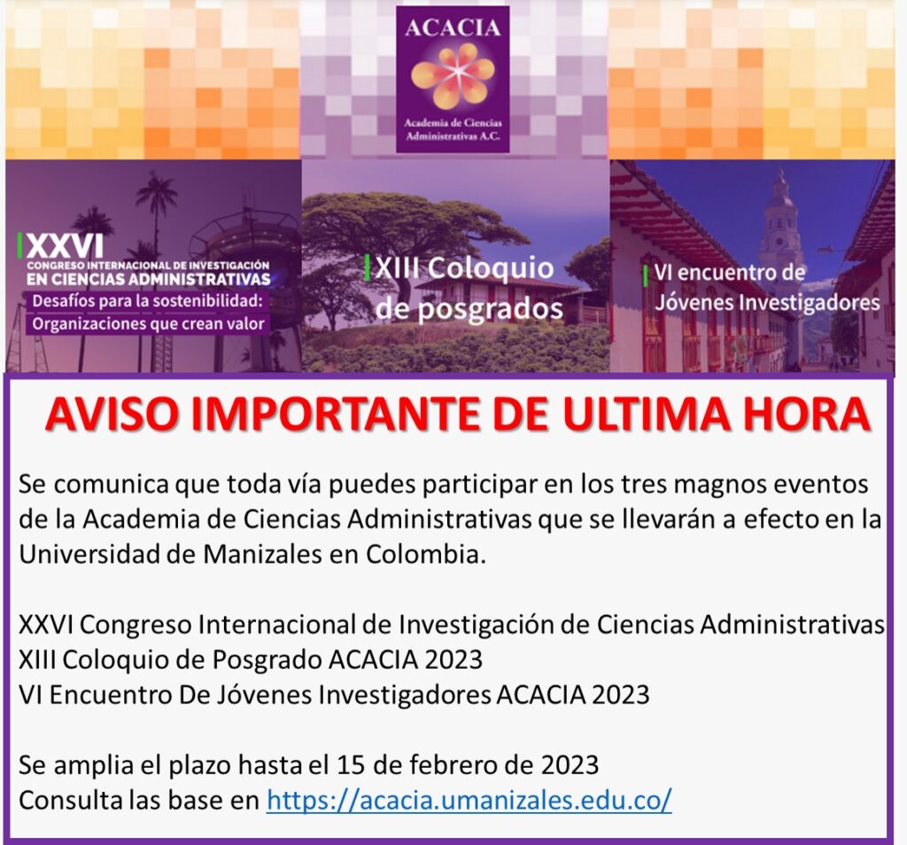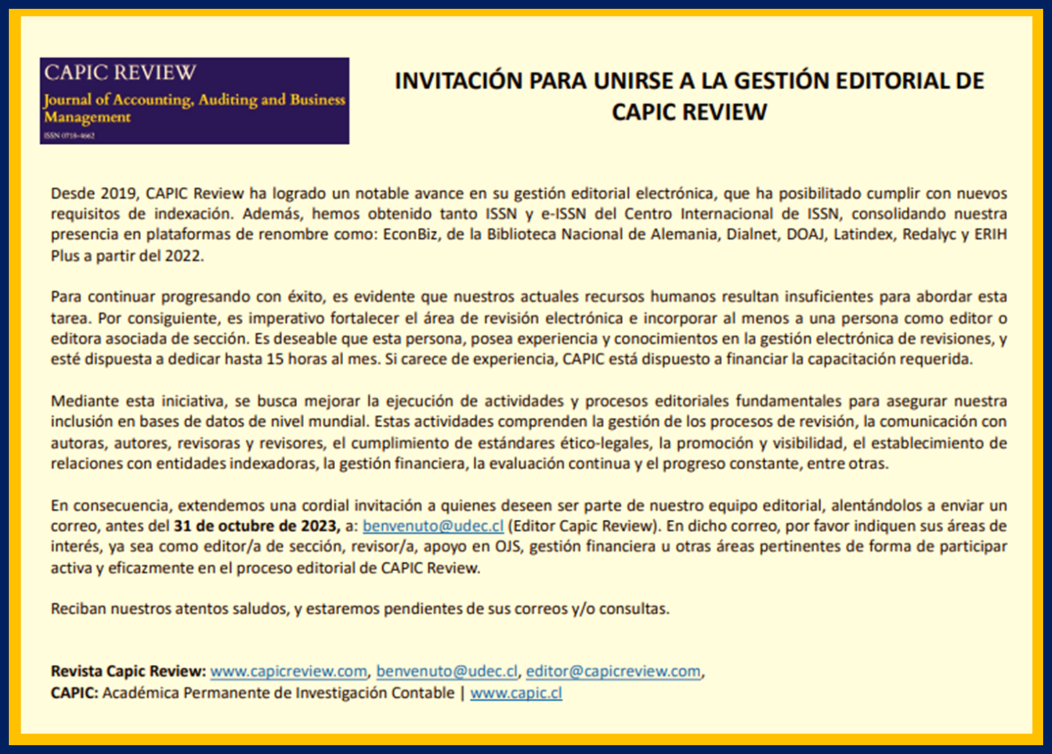 La Academia de Ciencias Administrativas AC Hace extensa la invitación realizada por la Conferencia Académica Permanente de Investigación Contable para unirse a la gestión editorial de Capic Review. Así como al Seminario de Difusión de Investigación Contable, organizado por la Universidad Central de Colombia, para el jueves 26 de octubre a las 11:00 horas de Chile.
