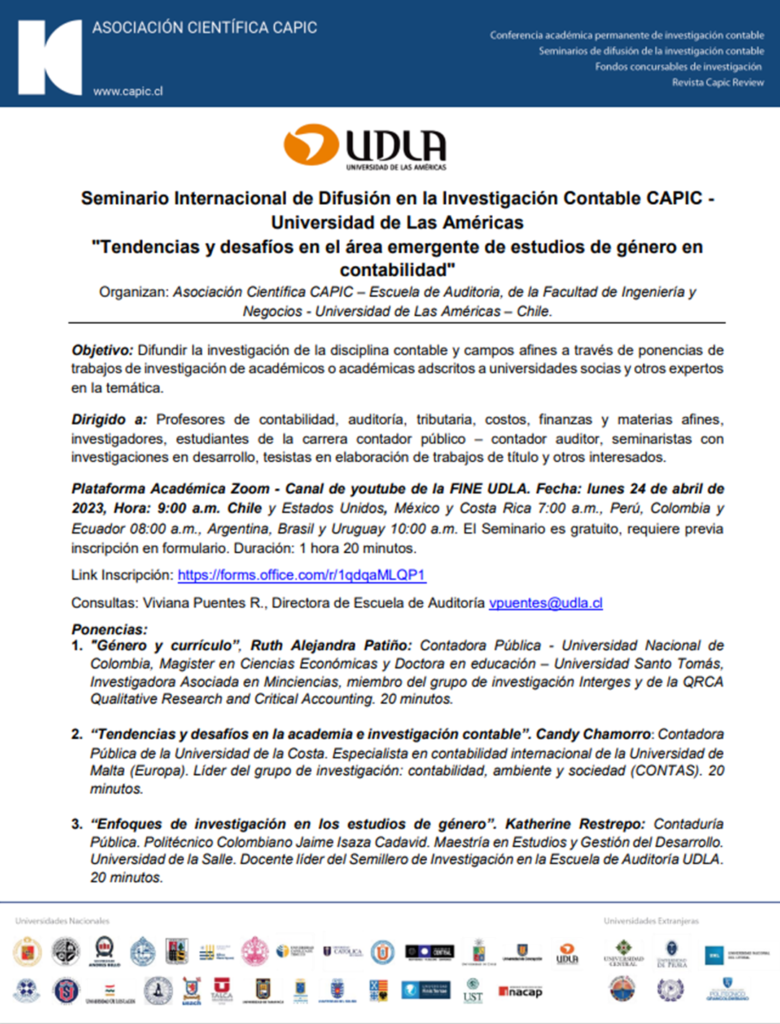 En el contexto de las actividades de Difusión de Investigación Contable Ciclo 2023, les invitamos al Seminario on–line de difusión de investigación contable “Tendencias y desafíos en el área emergente de estudios de género en contabilidad” organizado por Escuela de Auditoria, de la Facultad de Ingeniería y Negocios – Universidad de Las Américas – Chile y la Asociación Científica CAPIC.