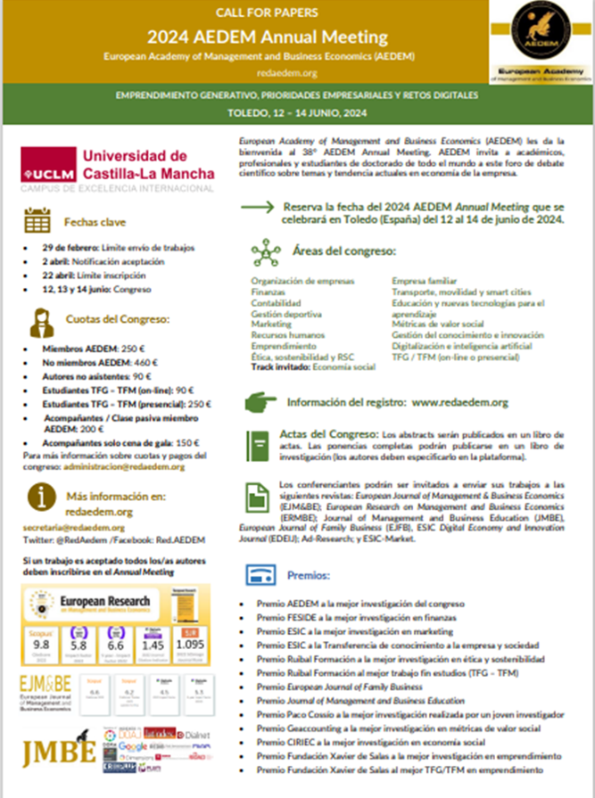 La Academia de Ciencias Administrativas A. C. le hace la atenta invitación a participar en el próximo Congreso de European Academy of Management and Business Economics (AEDEM)